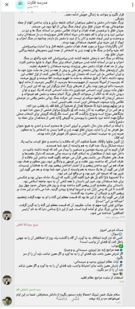 - خبر سوم این است: آقاخامنهای در پیامی به جوانان قارهی اروپا این حرف را میان آوَرد که ج،اایران "مقابله با نظم ناعادلانه و تحکّم نظام سلطه در جهان کنونی" را در سر دارد و بناش این است "نظام عادلانهی ملّی و بینالمللی اسلامی" پدید بیاورَد؛ به تعبیر وی "دعویِ بزرگی که ایران اسلامی، پرچم آن را برافراشته و زورگویان فاسد و مفسد را برآشفته است."