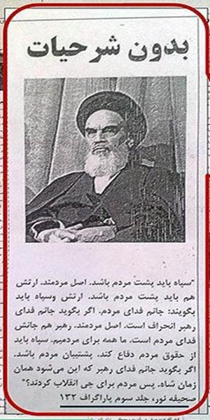 عین متن درجشده: "سپاه باید پشت مردم باشد . اصل مردمند . ارتش هم باید پشت مردم باشد . ارتش و سپاه باید بگویند : جانم فدای مردم . اگر بگوید جانم فدای رهبر انحراف است . اصل مردمند . رهبر هم جانش فدای مردم است . ما همه برای مردمیم . سپاه باید از حقوق مردم دفاع کند . پشتیبان مردم باشد . اگر بگوید جانم فدای رهبر که این میشود همان زمان شاه . پس مردم برای چی انقلاب کردند ؟ " ( امام خمینی، صحیفه نور، جلد سوم پاراگراف ۱۳۲ ) منبع
